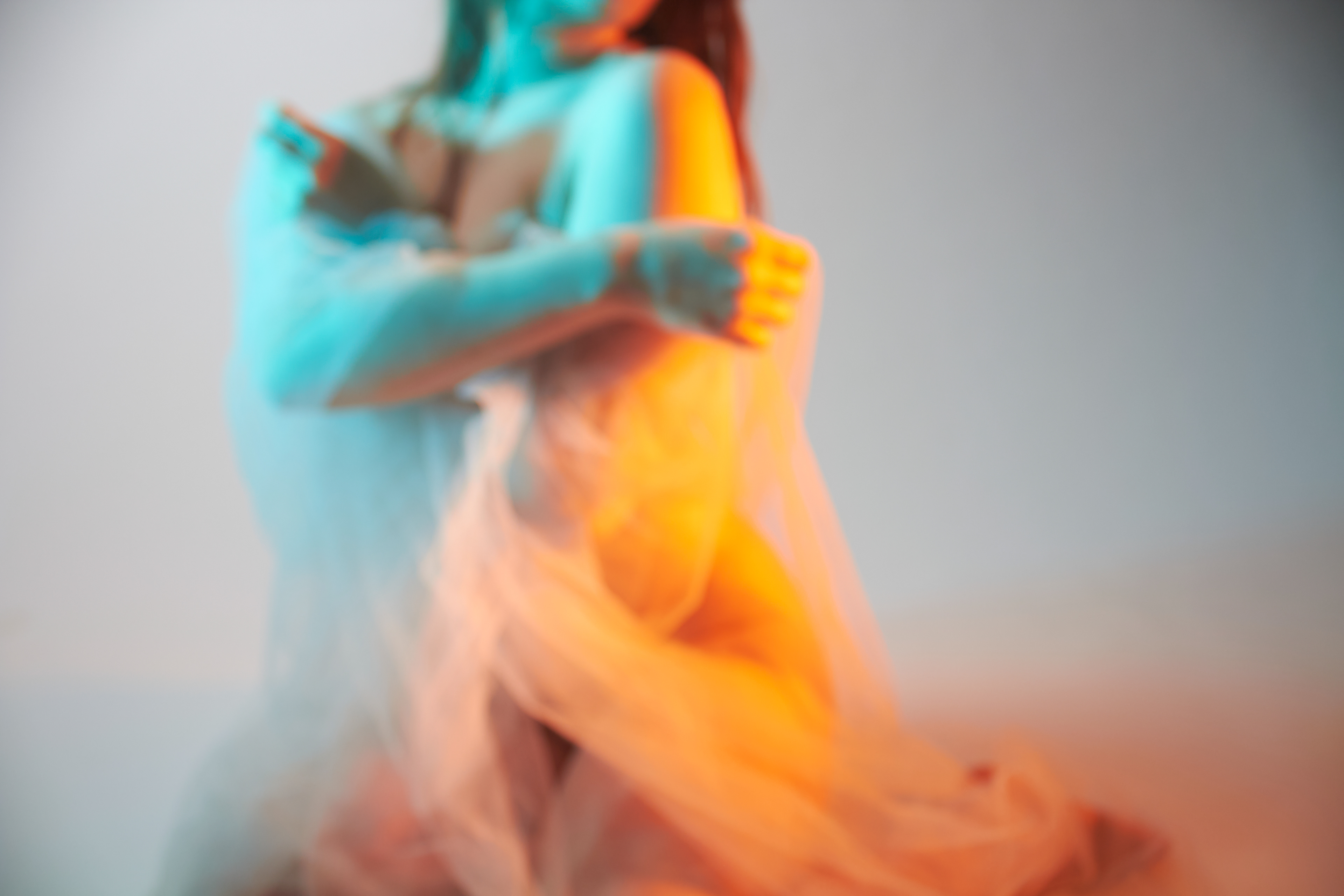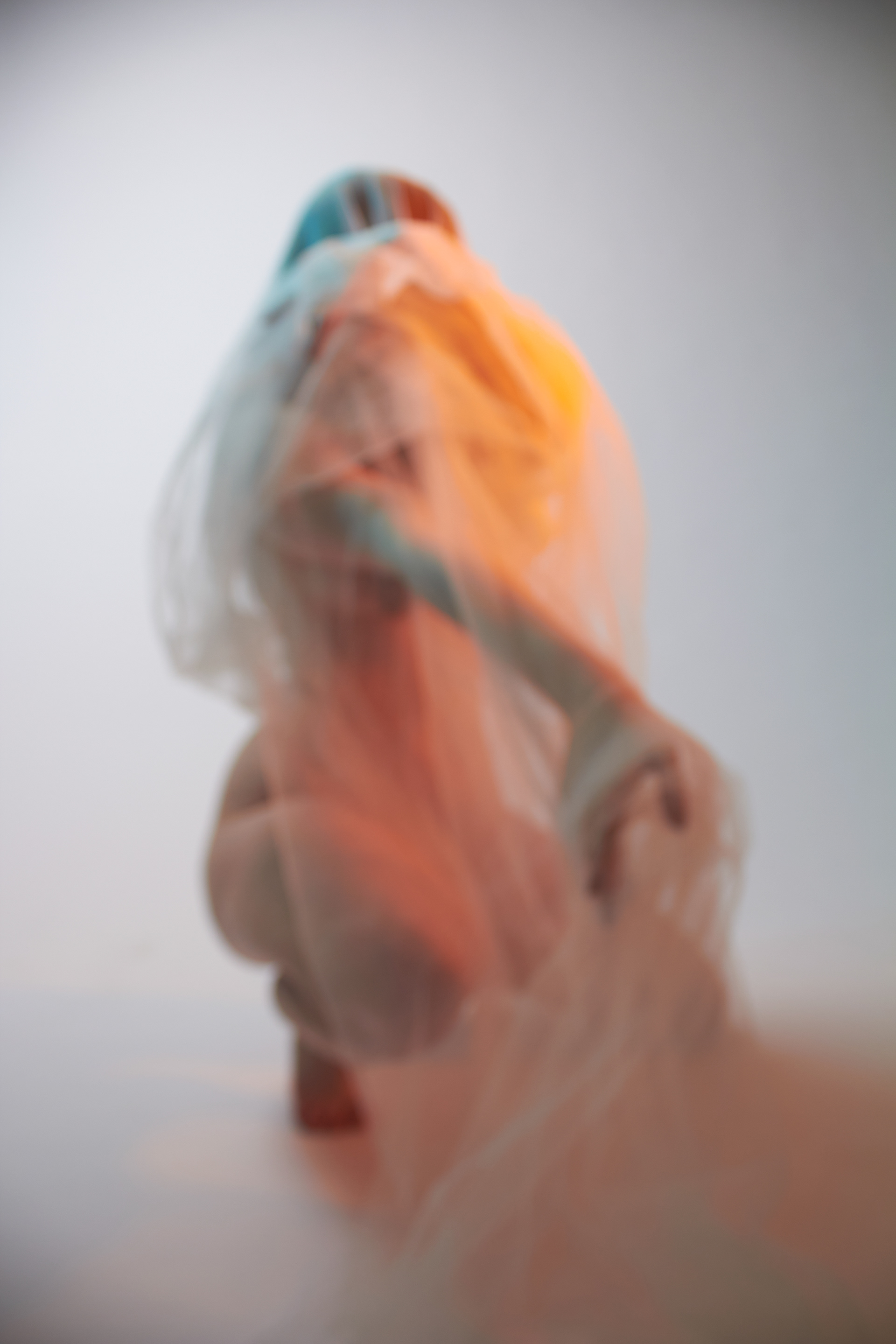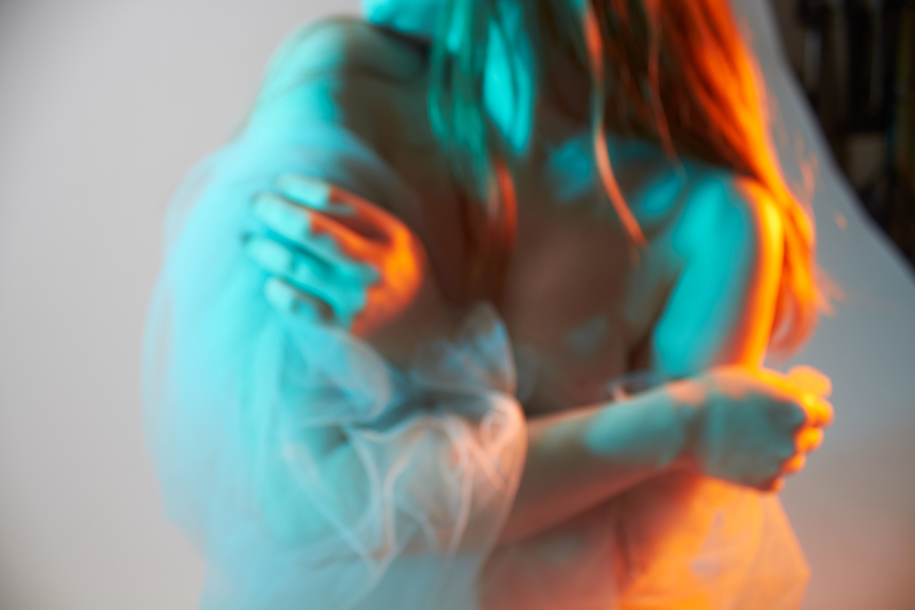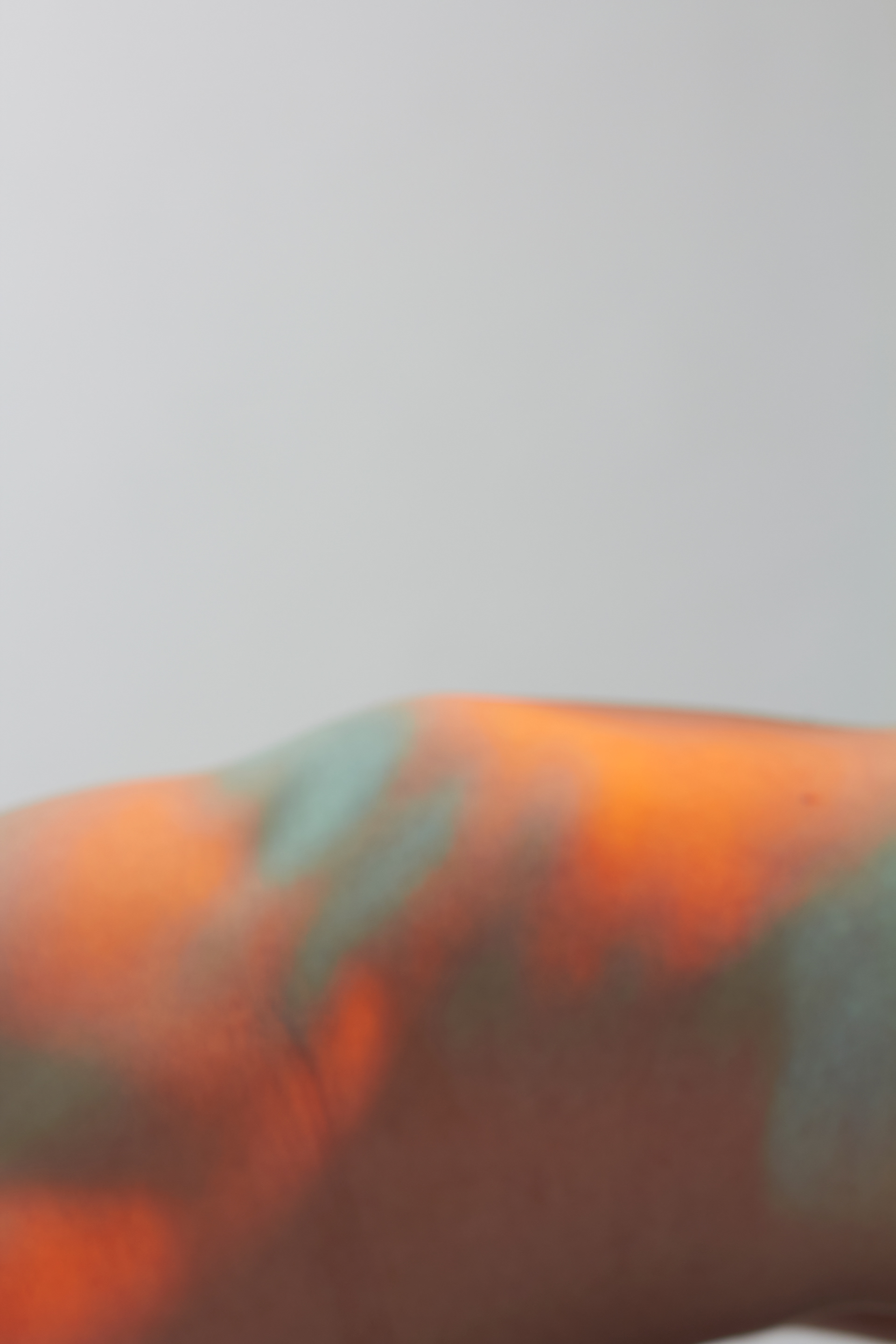 entstanden, den Perfektionismus zu umgehen und seine übrigen Sinne, hauptsächlich das Hören und Fühlen, zu schulen. Beim Fotografieren wurde also durch das fehlende Sehen mit dem Zufall des Ausschnittes gespielt. Zwar hat das Bild einen Vorder- und Hintergrund, die Konturen verschwimmen jedoch ineinander und die Komposition verzichtet absichtlich auf die gewohnte Schärfe. Es wirkt damit weniger komplex. Die verwaschenen Farben finden sich zwischen Komplementär und Warm-Kalt Kontrast wieder. Sie geben dem Körper trotz unklarer Konturen eine dreidimensionale Optik. Der weiblich gelesene Oberkörper wird wie eine Landschaft im Motiv präsentiert. Das Werk bewegt sich in einem schwingenden Zustand der Komplexität und Einfachheit, Erkennbarkeit und Unerkennbarkeit, Verstehen und Interpretation.