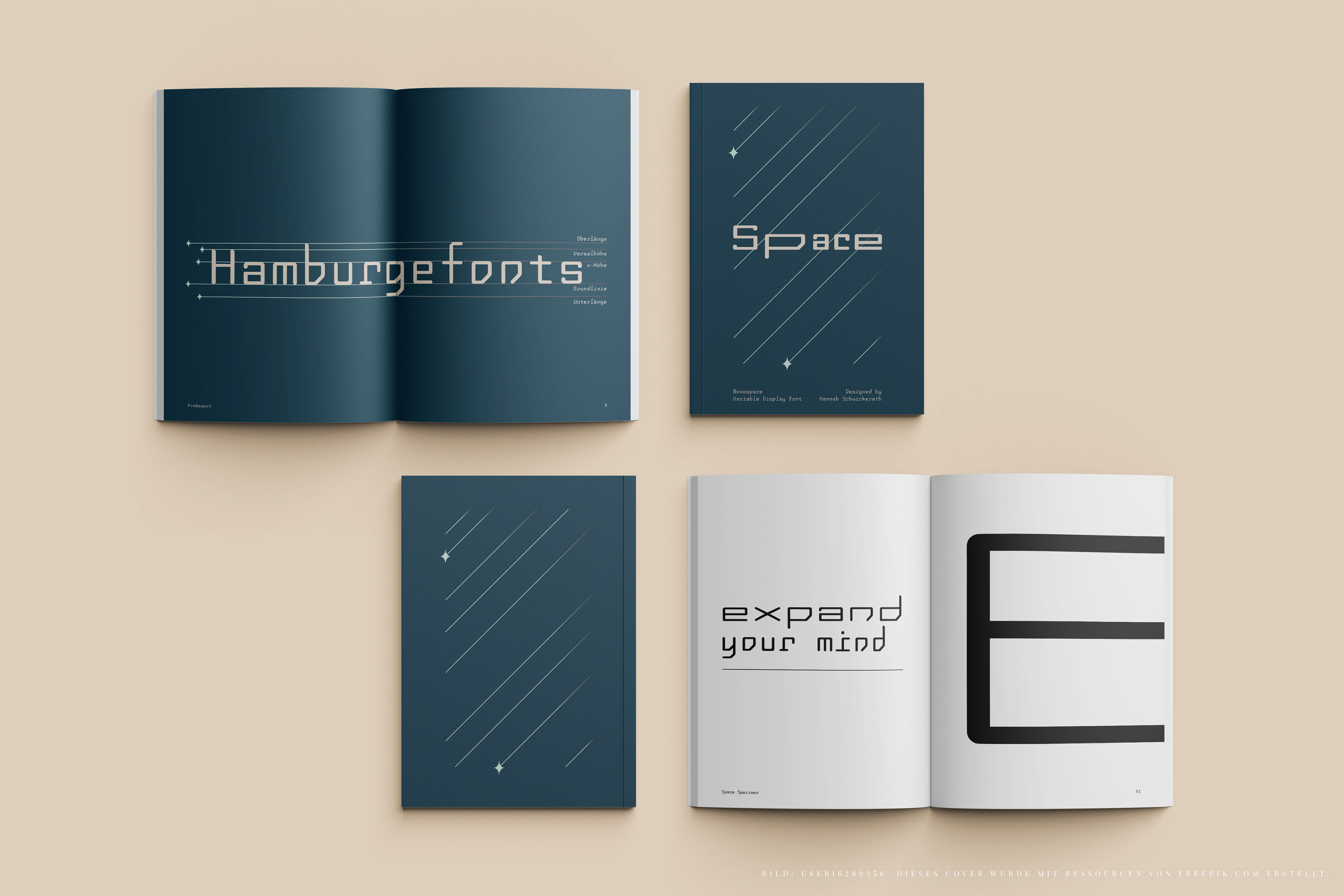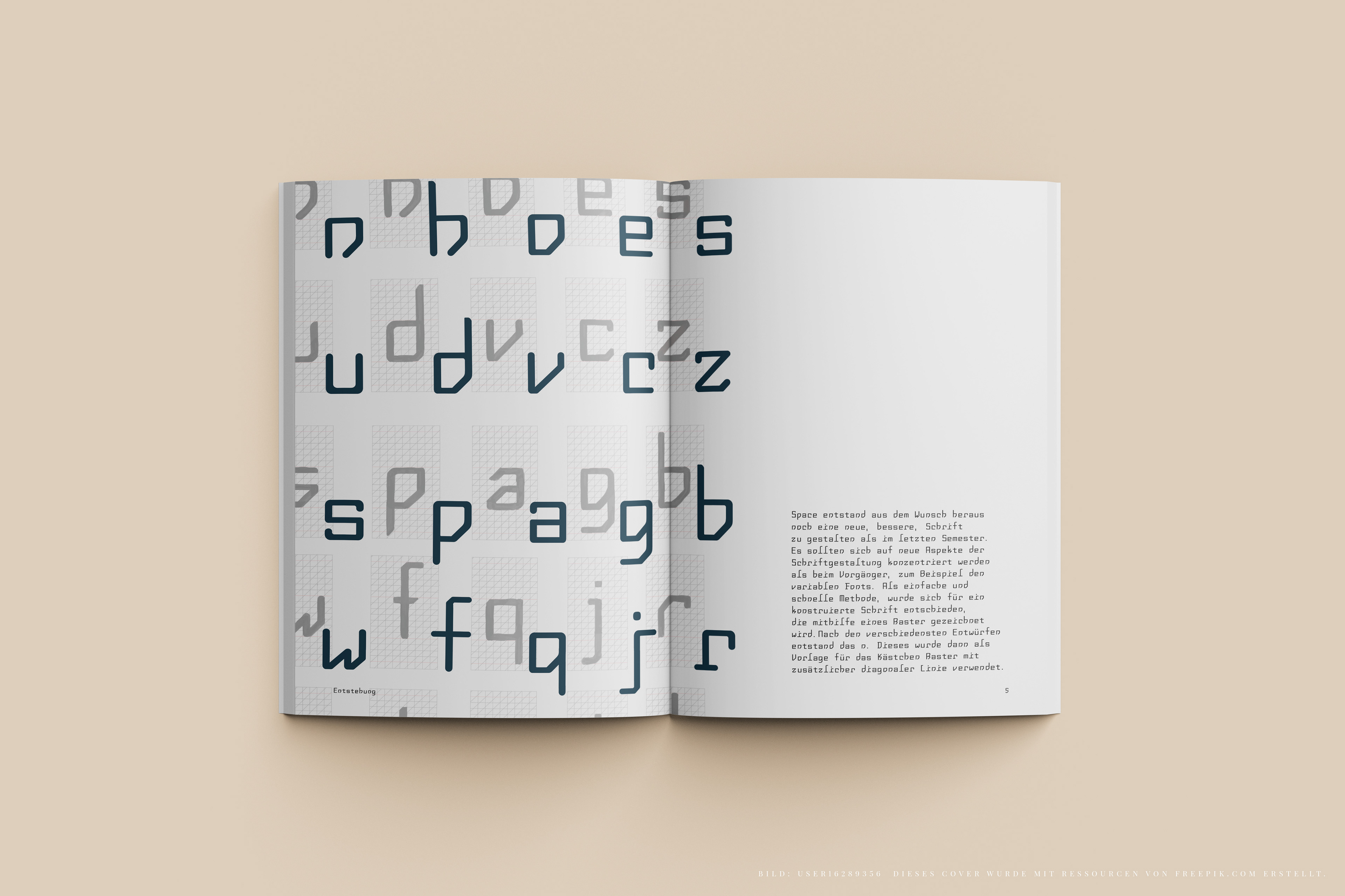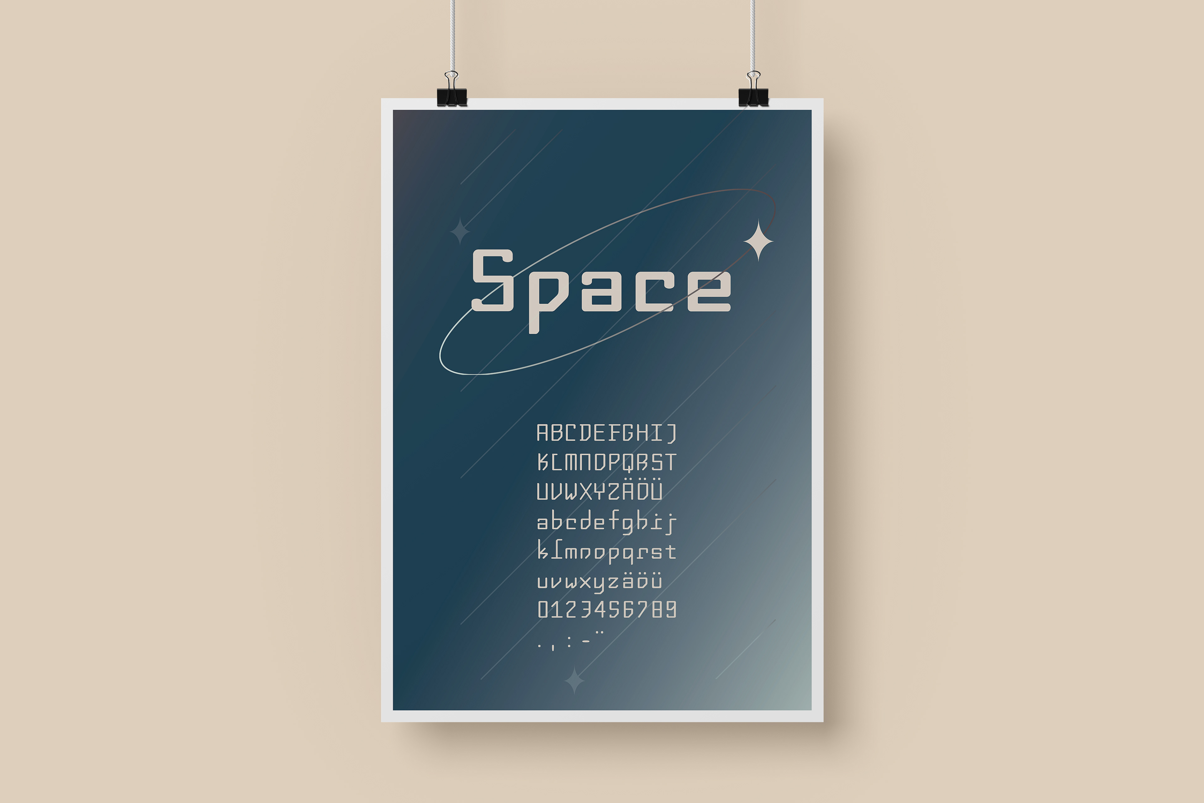 Space ist eine variable Monotype Font im futuristischen Stil. Die konstruierte Schrift wurde von einem Raster aus entworfen und danach im Programm Glyphs umgesetzt. Sie eignet sich als Display Font und lässt durch die variablen Schriftschnitte in der horizontalen Achse viel Spielraum. Space wurde im Rahmen eines Semesterprojektes im Modul Design Typografie an der Hochschule Trier, Fachrichtung Kommunikationsdesign entworfen.